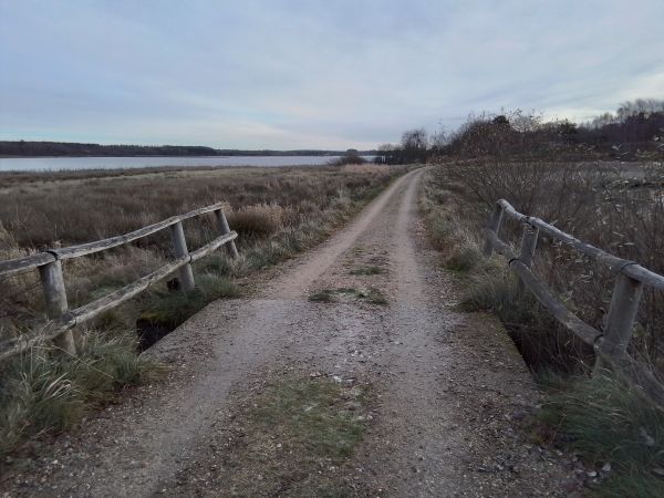 Bro over Femøresvejen. Til venstre ses den nye Bøllingsøs nordvestlige del. Det kunne naturligvis godt have været ført en tørvebane under broen her, men jeg ved bare ikke fra hvilket tørveværk. Vi er i fabrikant Emil Ernsts område. Imidlertid tror jeg dog på et afvandingskanal. Foto: Anders Falk Jensen 2025.