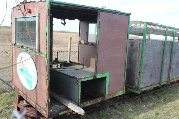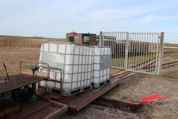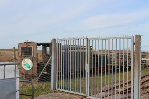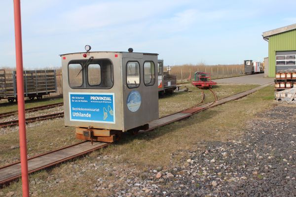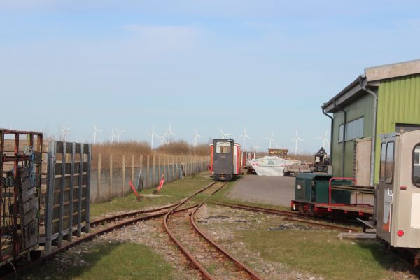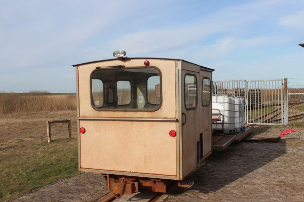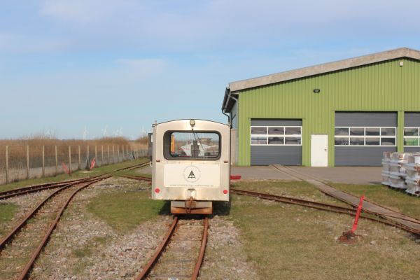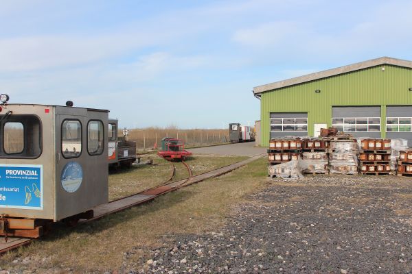 Længere ude holdt LKNMs materiel, et brunt lok, der ikke har nummer bagpå. Der står kun Schöma på pladen. Desuden en skurvogn og nogle flere vogne.